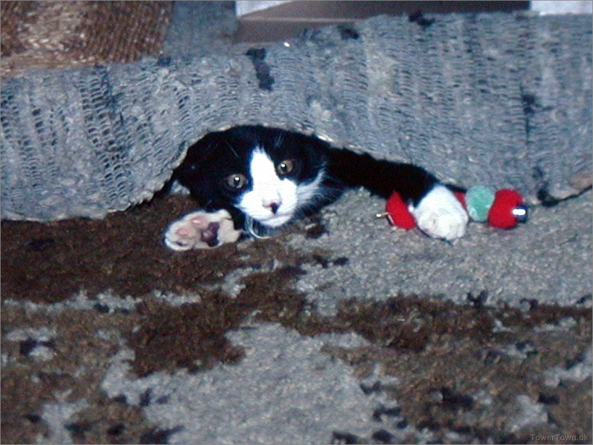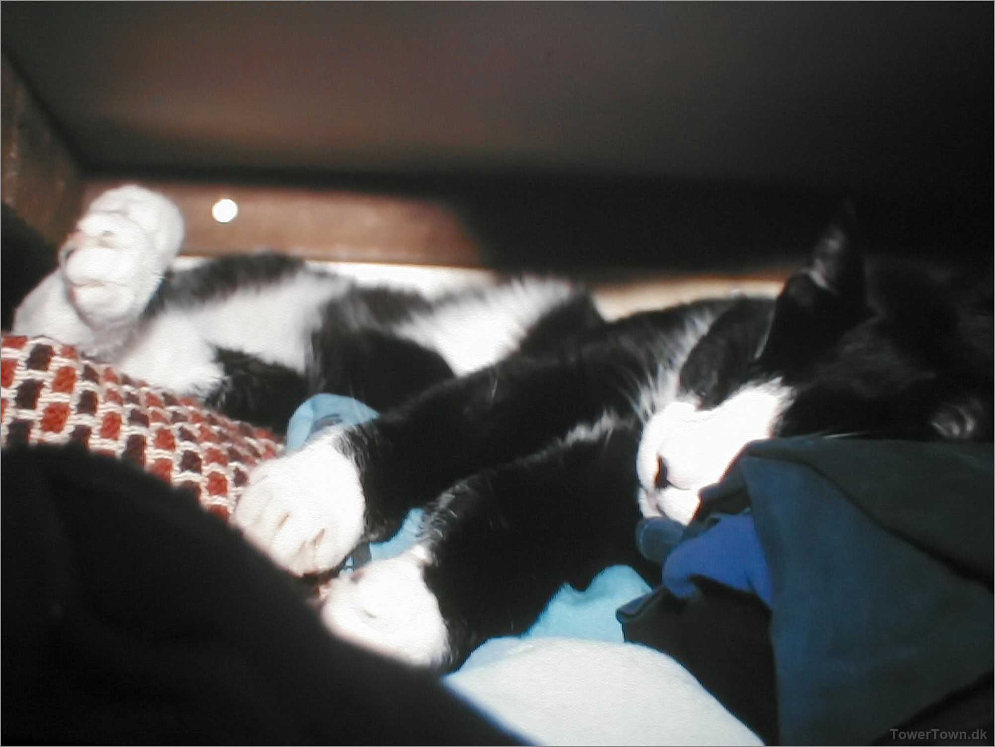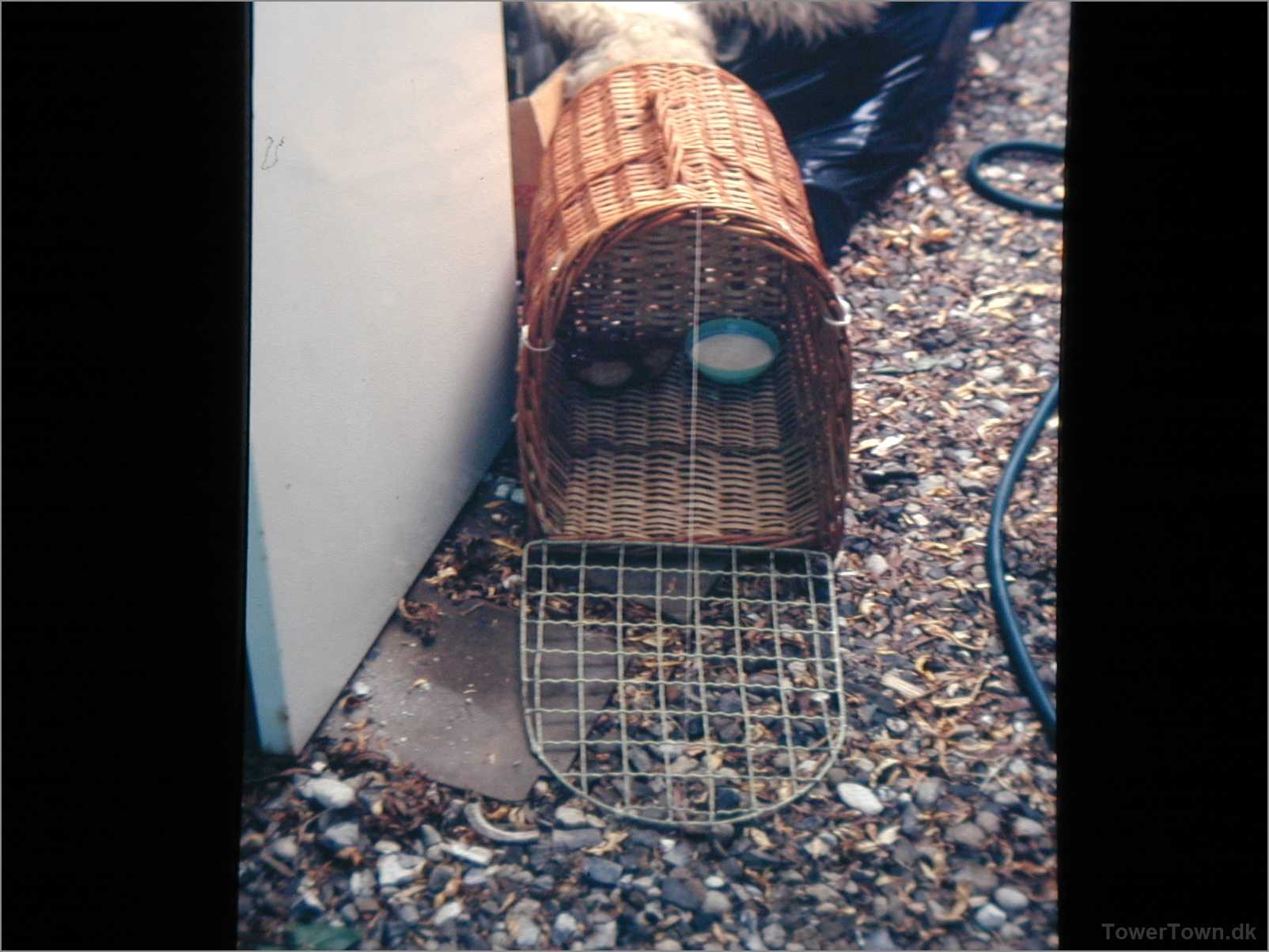 ... vi satte derfor noget mad i en transportkurv, hvis låge kunne lukkes inde fra huset via et snoretræk, og det varede ikke længe før vi kunne trække i snoren, og sikre os den moderløse killing, der hjerteskærende gik og kaldte på sin døde mor.