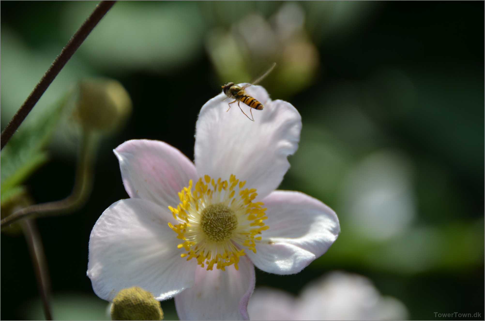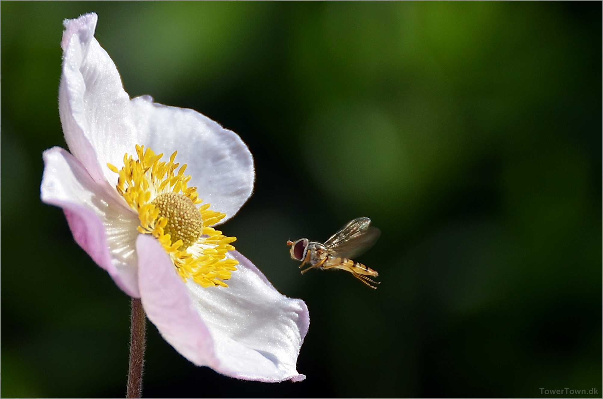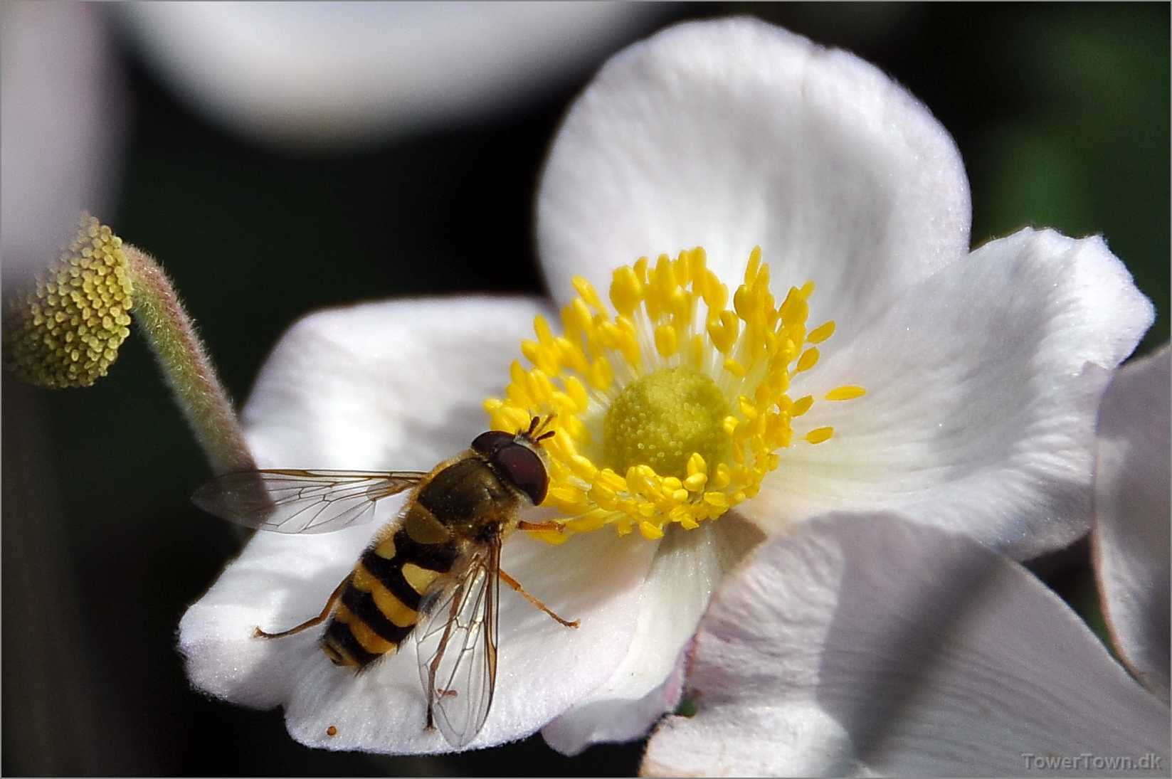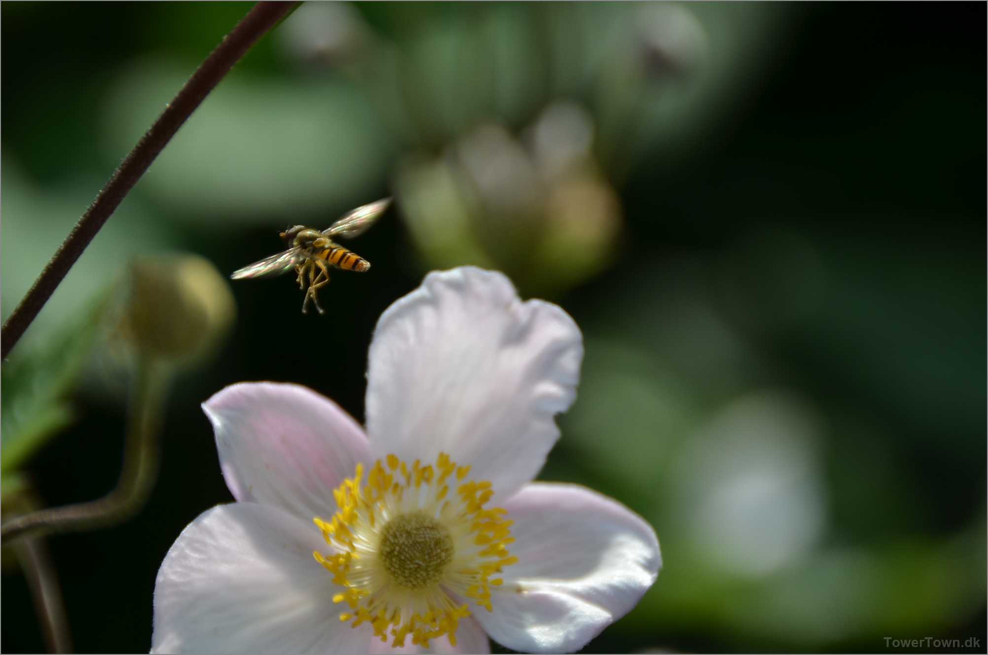En 'Syrphidae' er ved at lægge an til landing. Den kaldes også 'Svirreflue' eller 'Blomsterflue'.