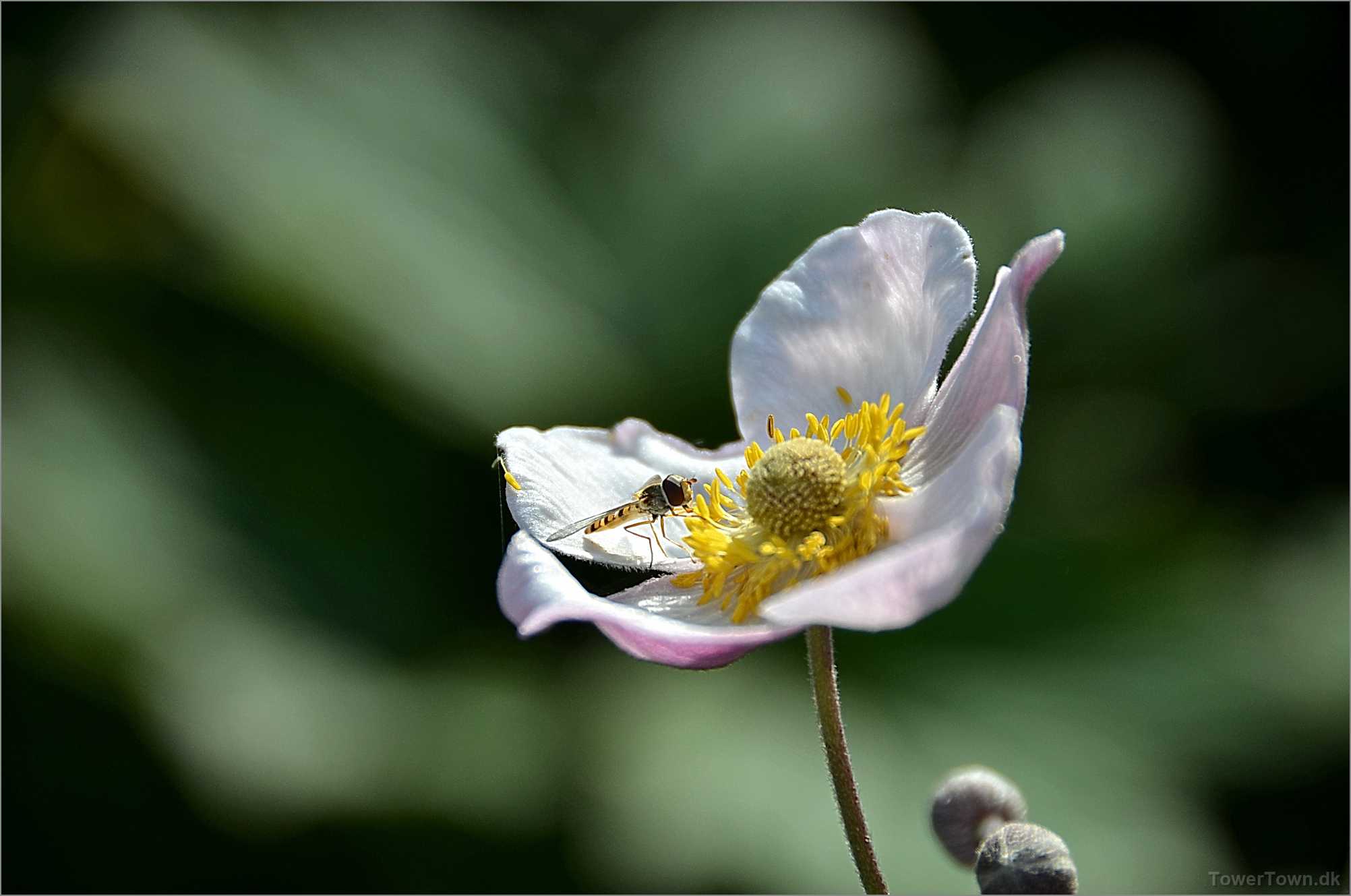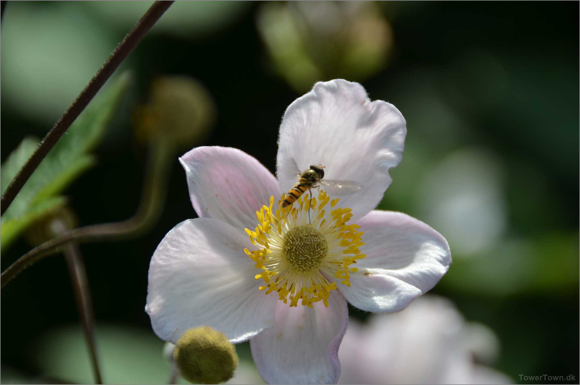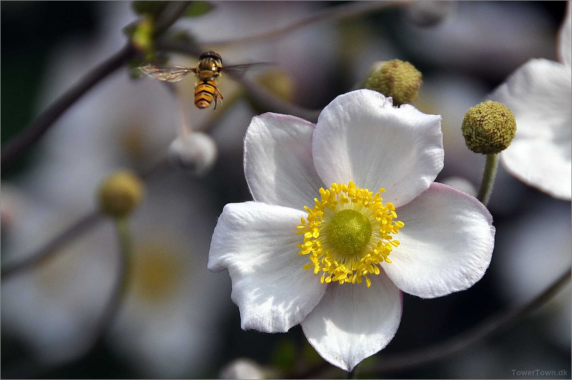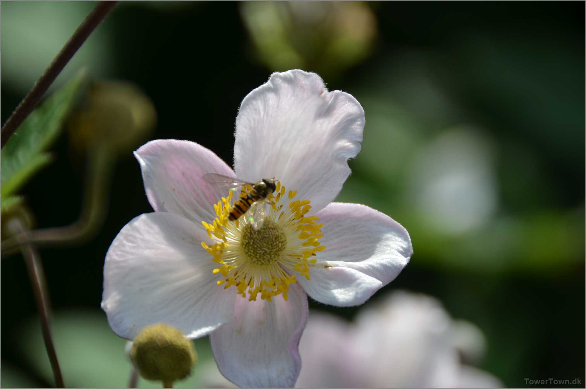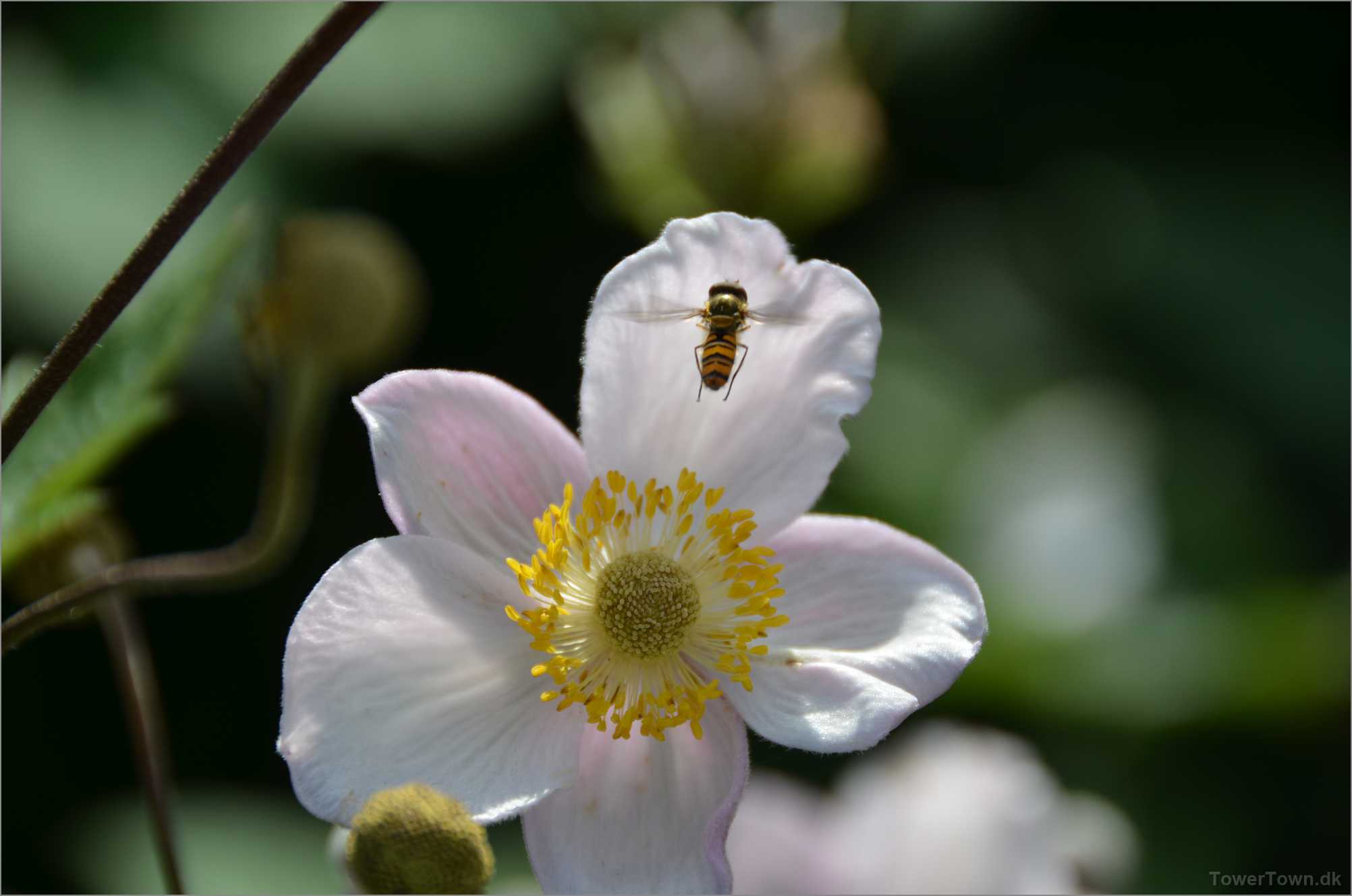 En 'Syrphidae' er ved at lægge an til landing. Den kaldes også 'Svirreflue' eller 'Blomsterflue'.