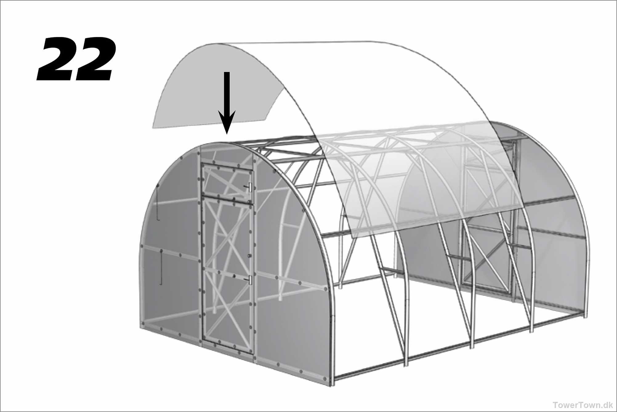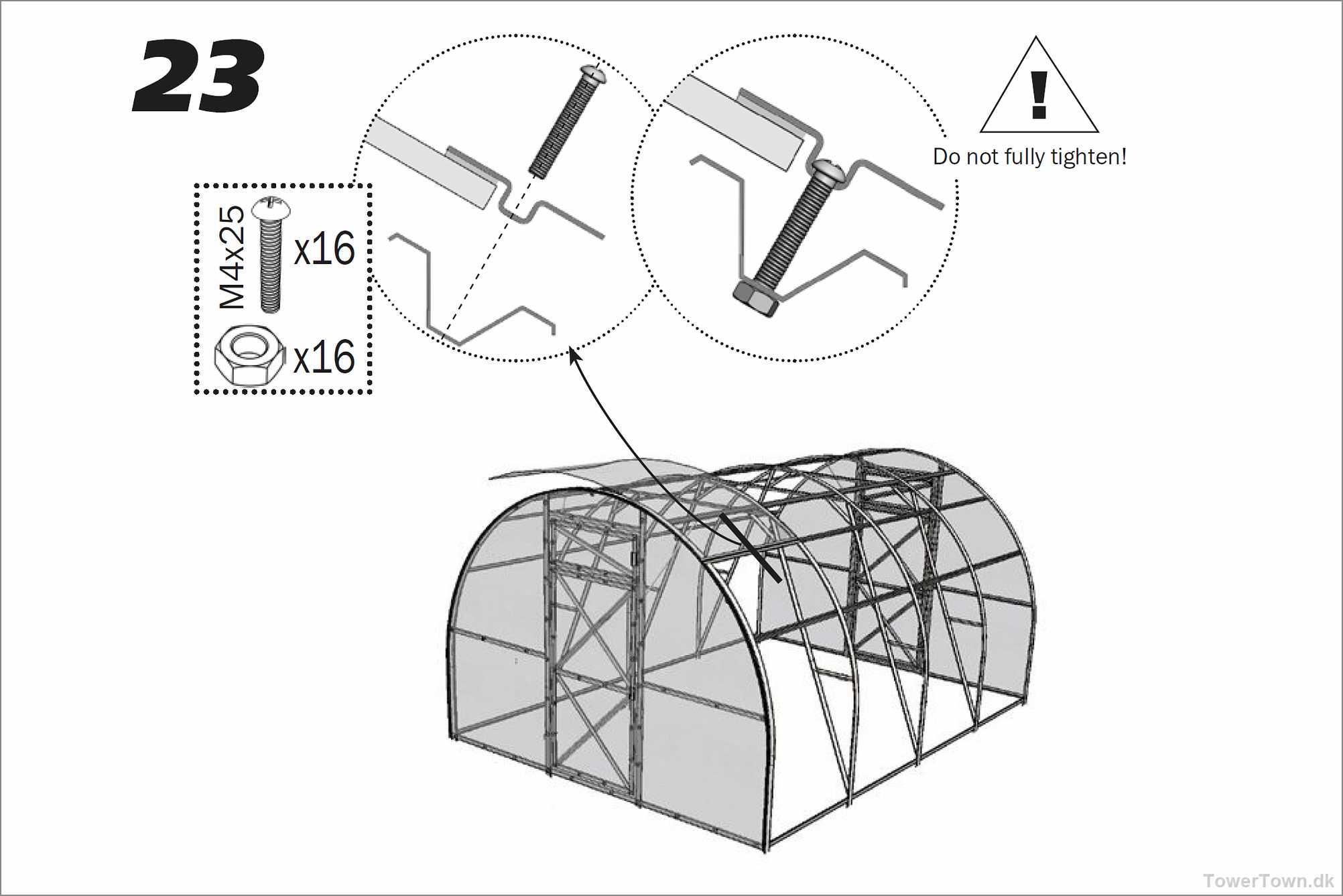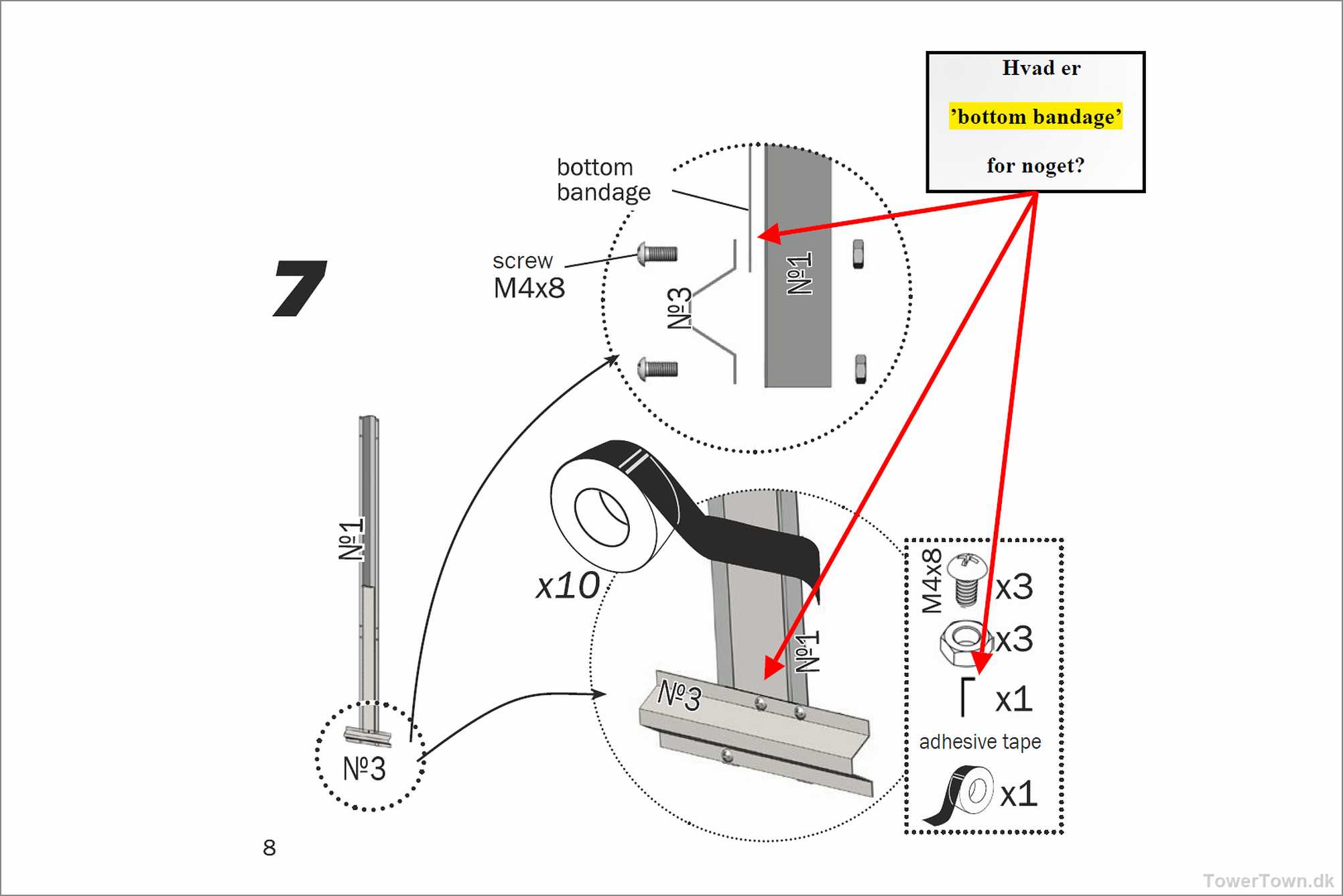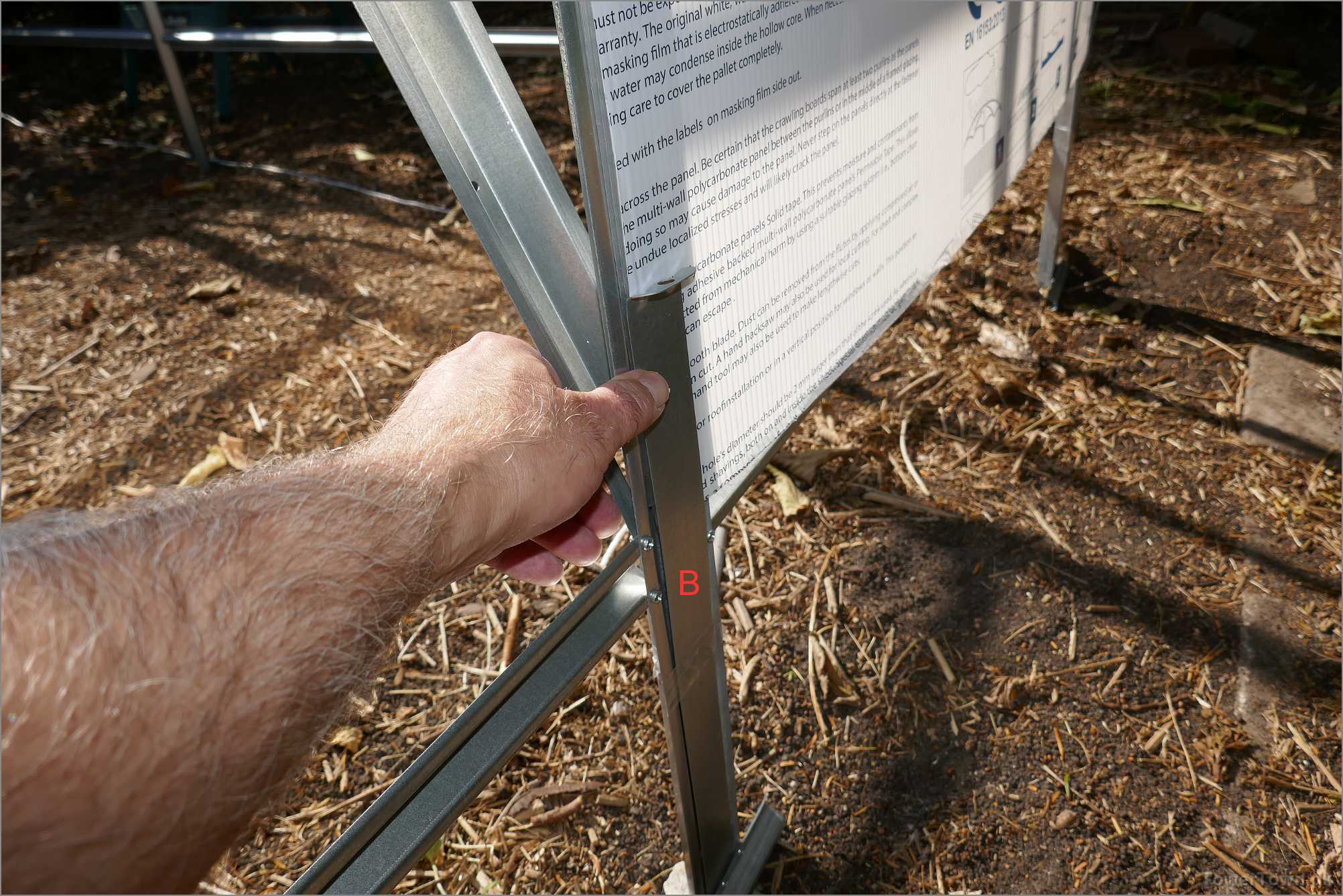 ... og kommer endelig frem til, at metalbåndet der spændes hen over drivhuset må være 'Top-bandage', hvorfor den nederste del så må være 'Bottom bandage' , hvilket så blev tilføjet grafikken, og sendt til forhandleren, med forslag om at få det tilføjet manualen i klar tekst, og dermed spare brugeren for hovedbrud og spildtid.