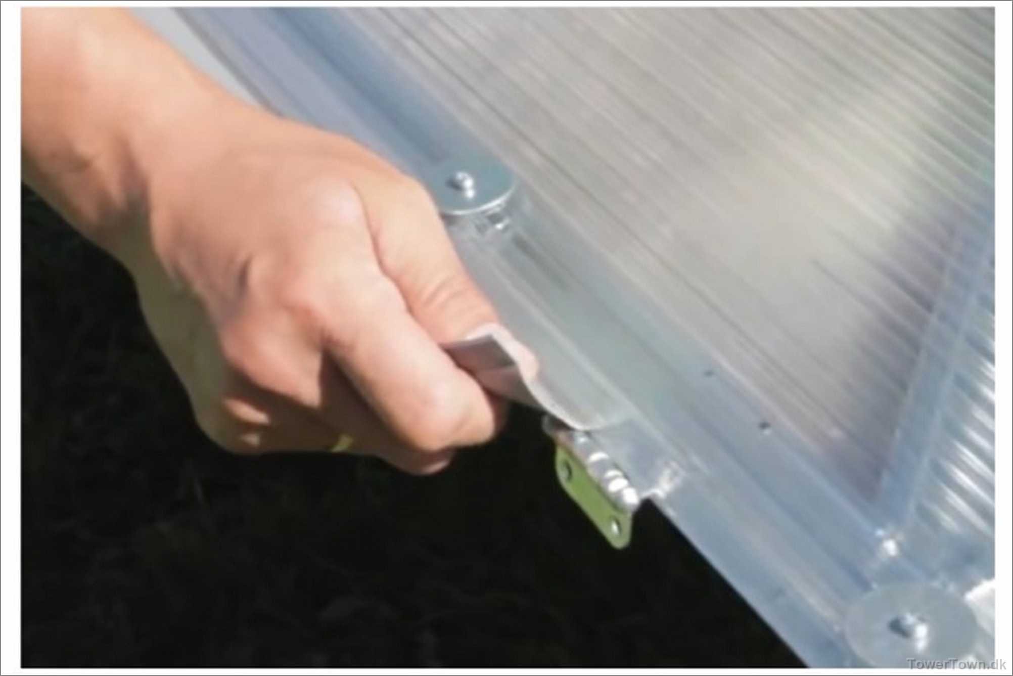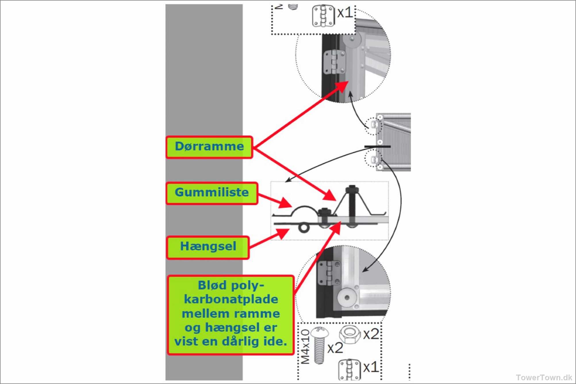 Forvirring 2: Manualen vil have en til at montere hængslet UDEN PÅ polykarbonatpladen, hviket jo vil kvæste den når skruen strammes, hvilket forgæves forsøges formidlet til forhandleren via bla. denne grafik.