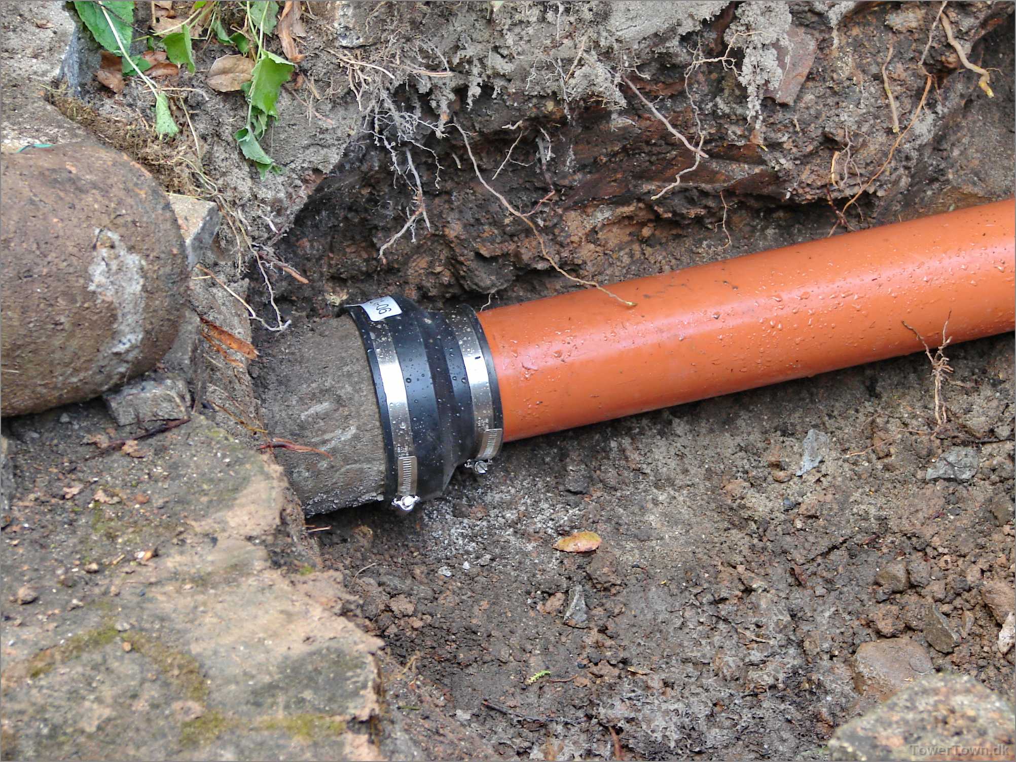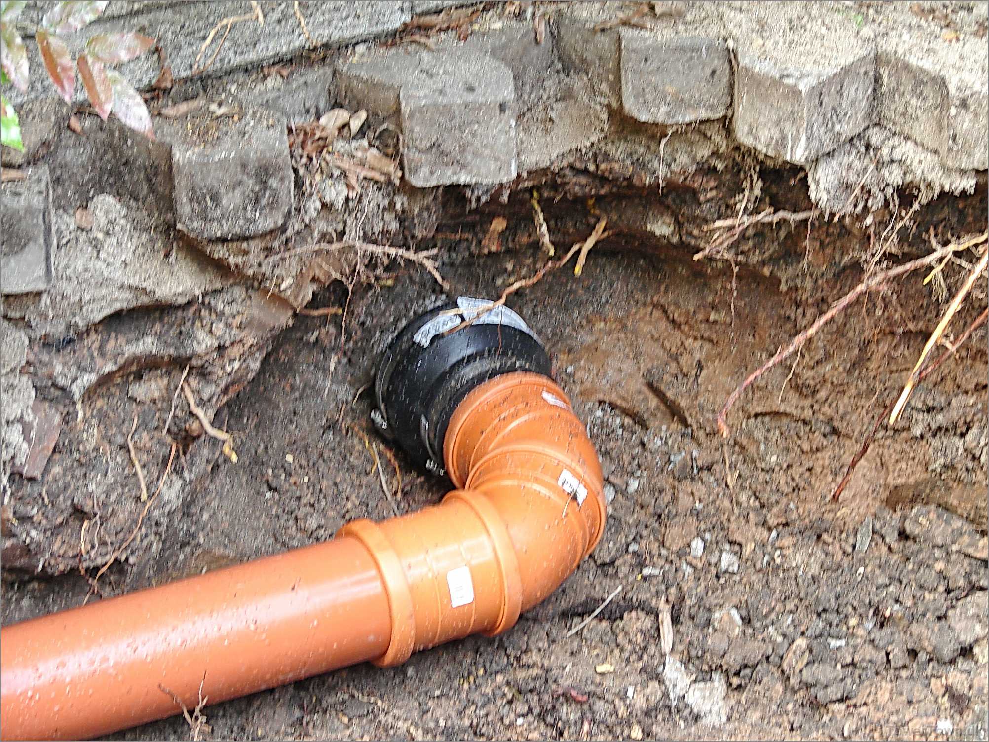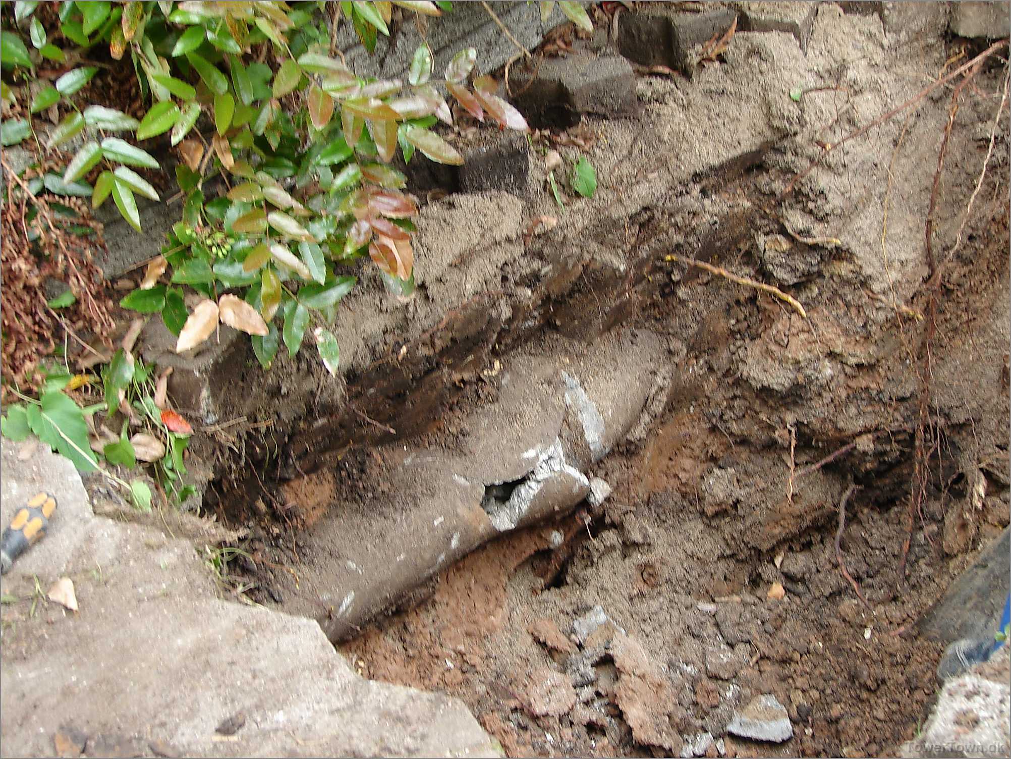Rødder fra busken ovenover, var trængt ind i cementrøret og stoppet det.