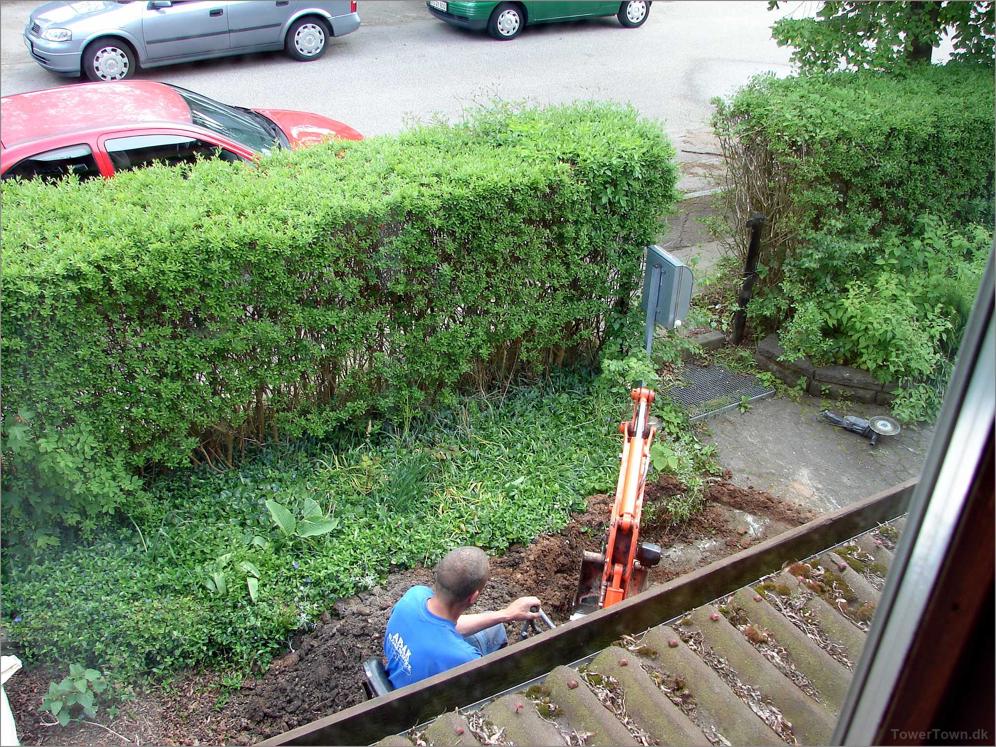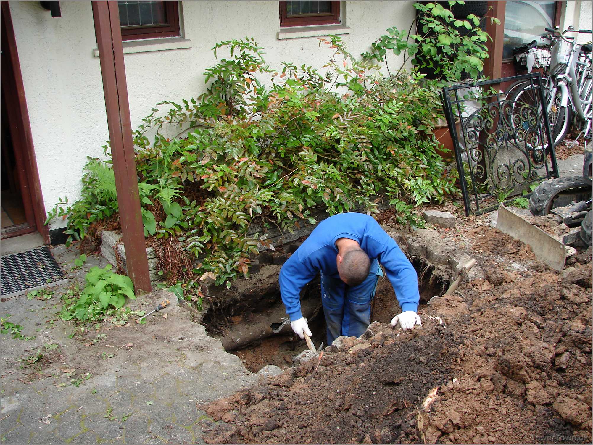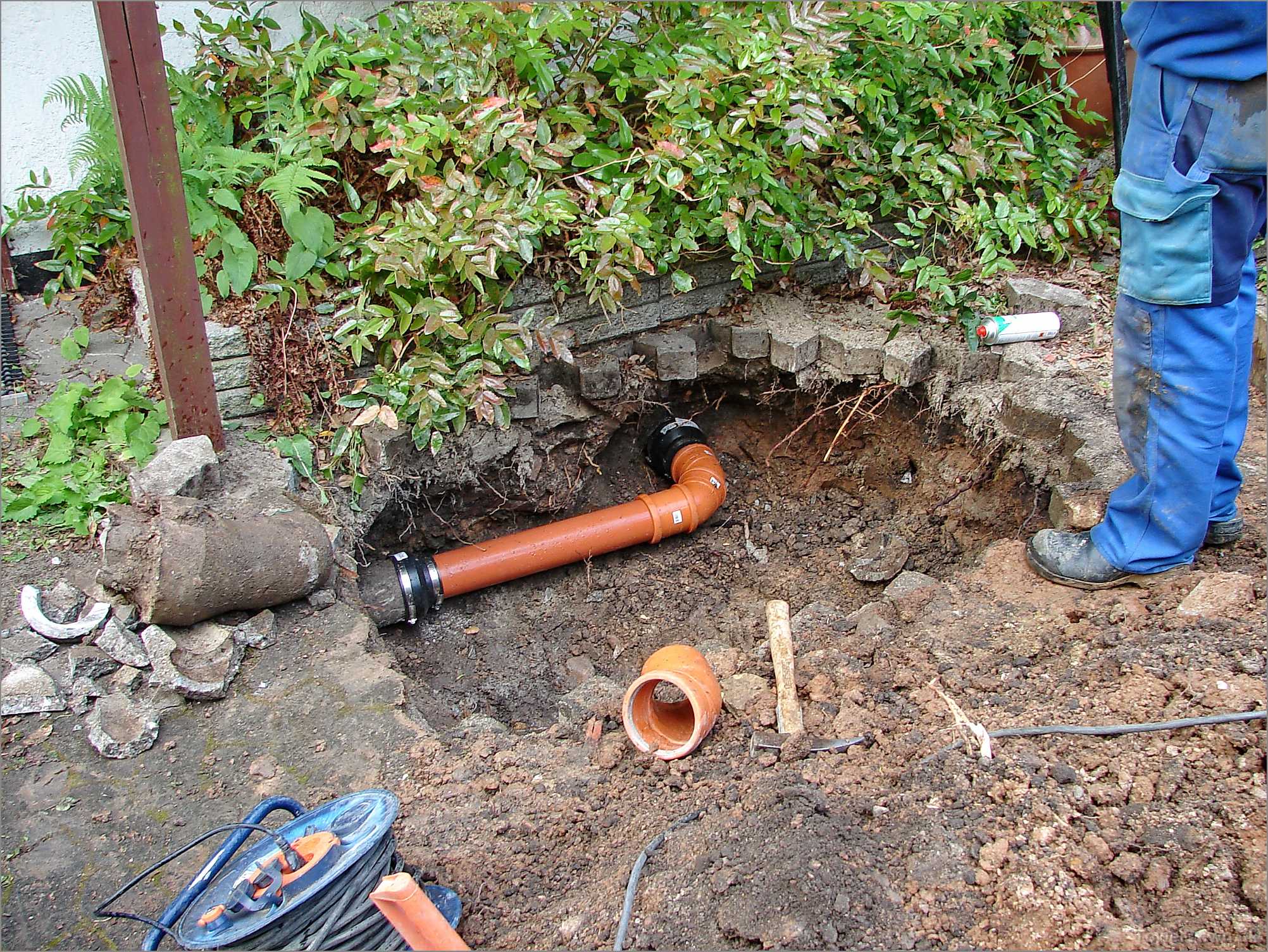 Rødder fra busken ovenover, var trængt ind i cementrøret og stoppet det.