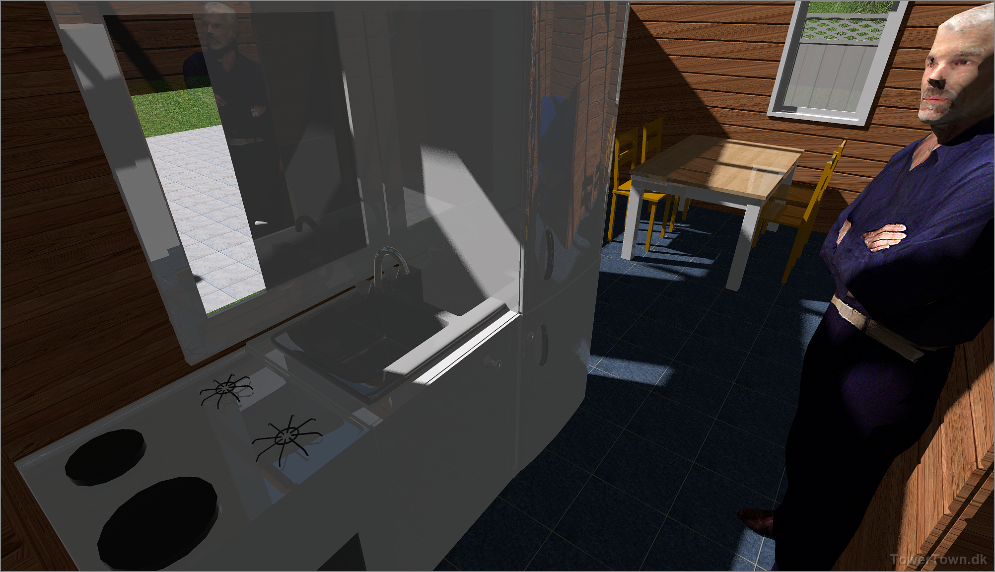 Minimalt køkken, hvor der ikke blev plads til et køkkenbord, med mindre kølefrys flyttes ind i soveværelset.