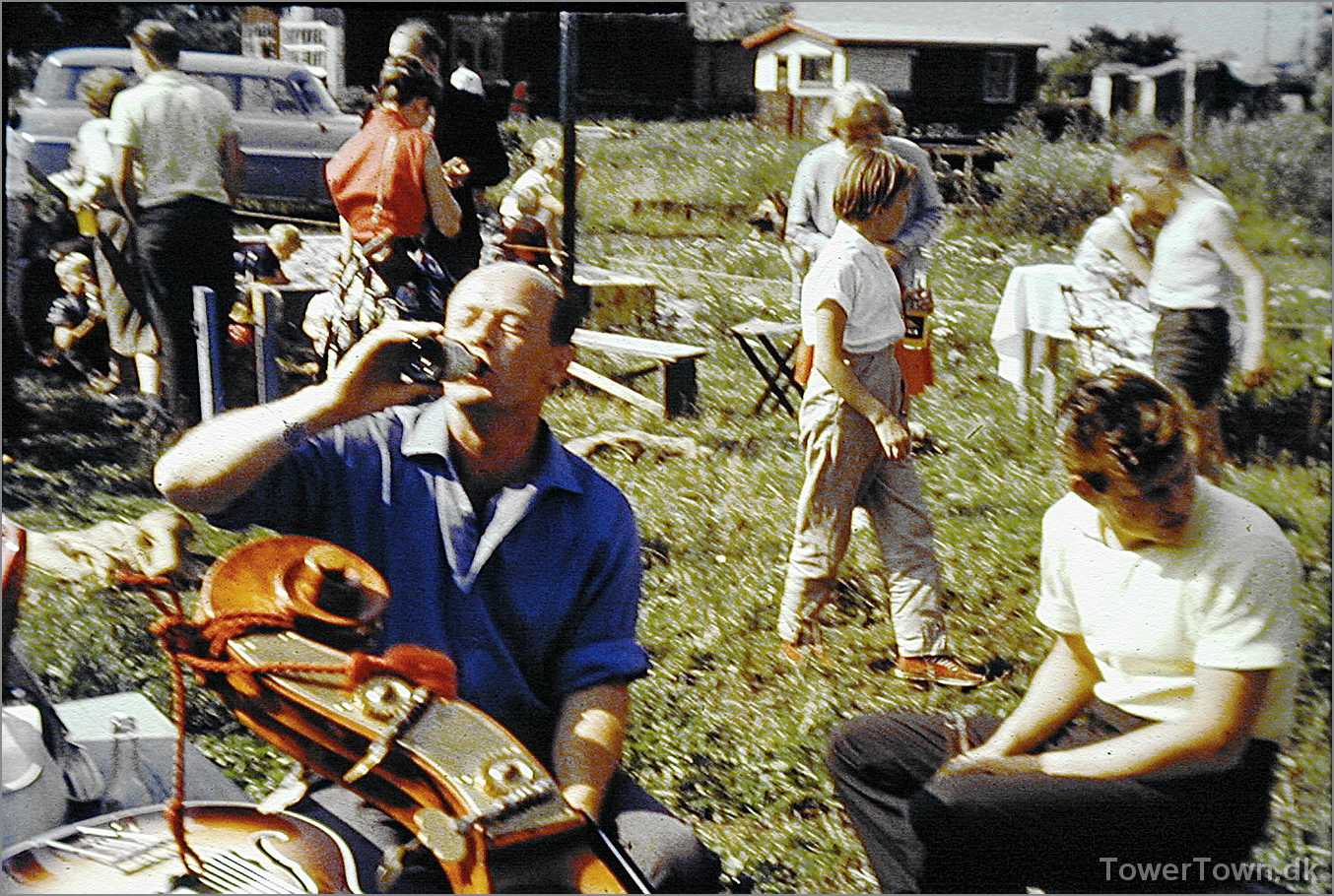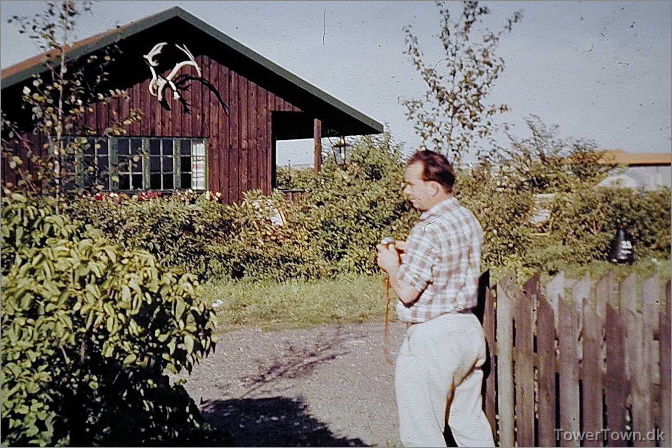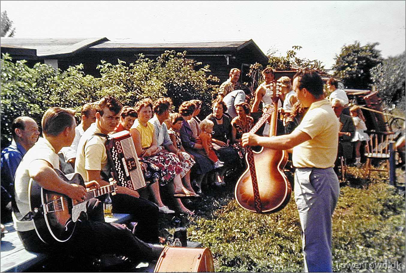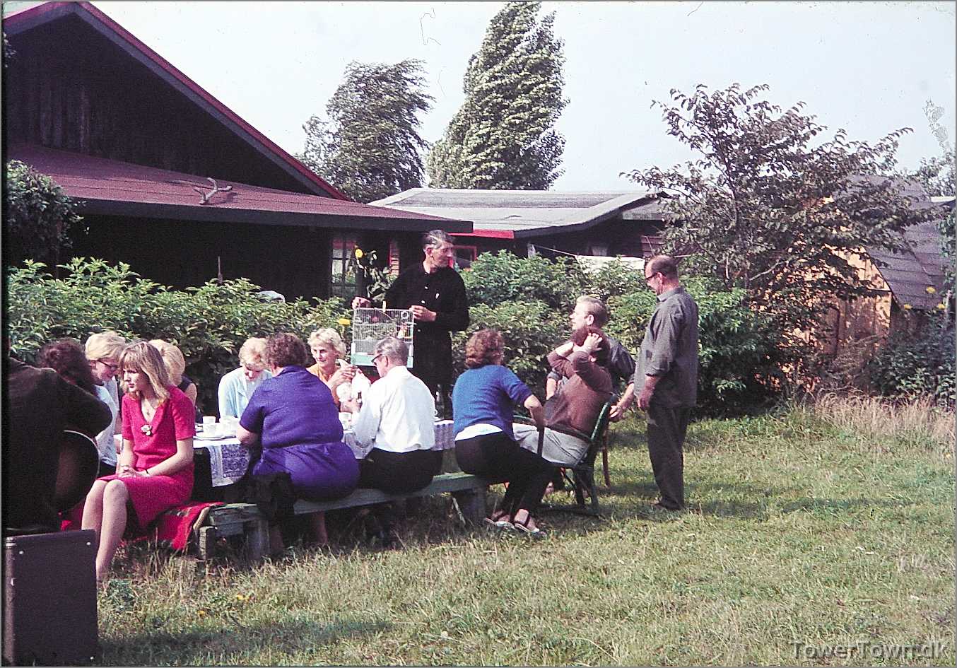 Festpladsen bag Hovedgaden 25. Hugo Berg (h19A) med fuglebur, Holger Baunbech yderst til højre.