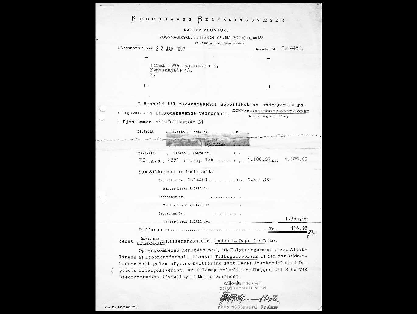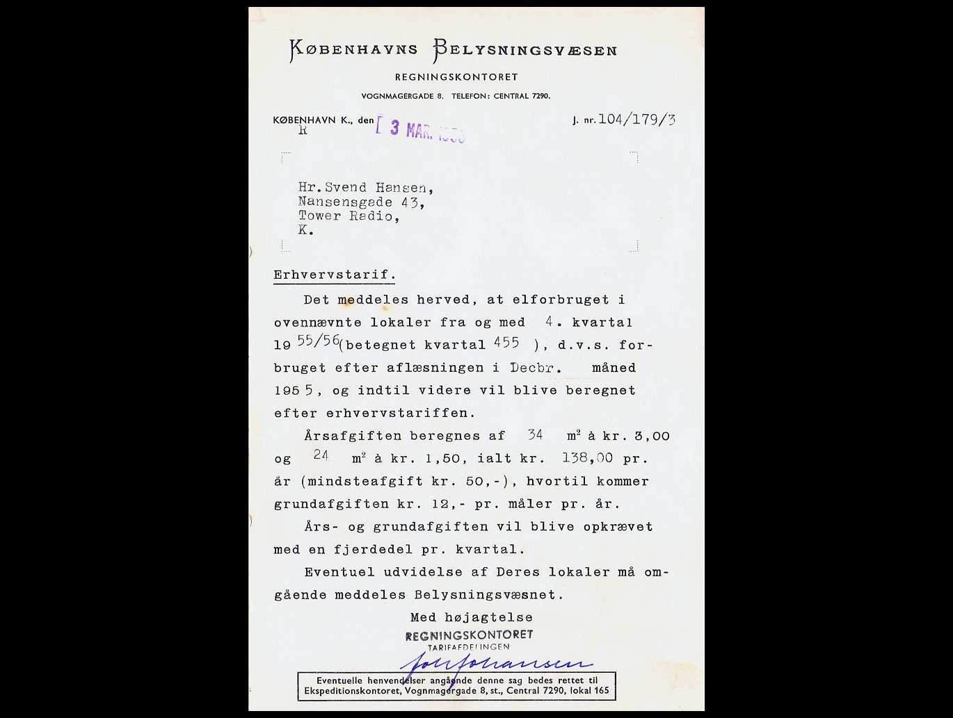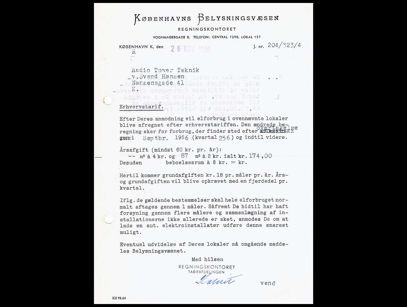 Udregning af EL-forbrug for de nye lokaler Nansensgade 41 i 1956.