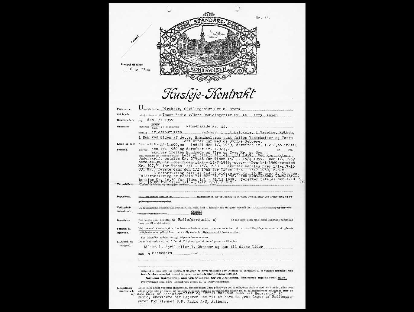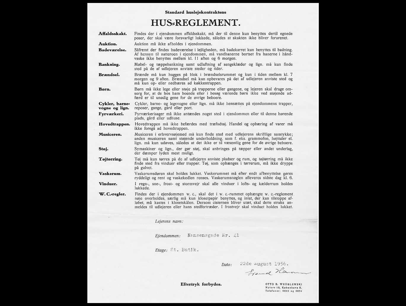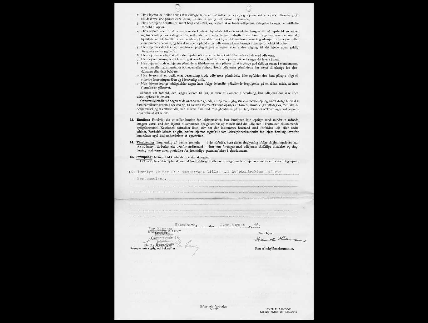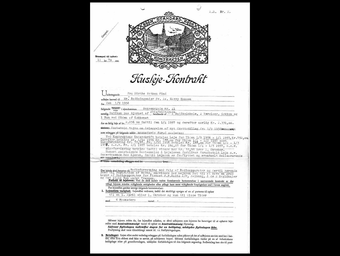 Husleje-kontrakt for Nansensgade 41 underskrevet d. 22/8-1956.