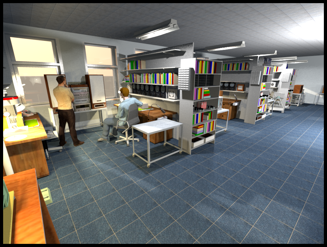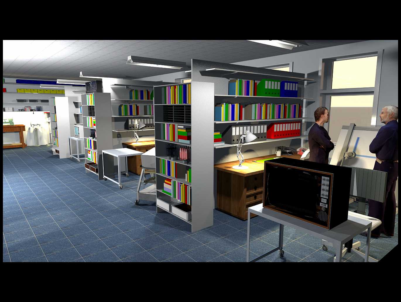 Udsnit af værkstedsdelen der rummede kontor og arbejdspladser for mester selv (længst væk) og op til fem lærlinge, samt et afsnit for kundemodtagelse.