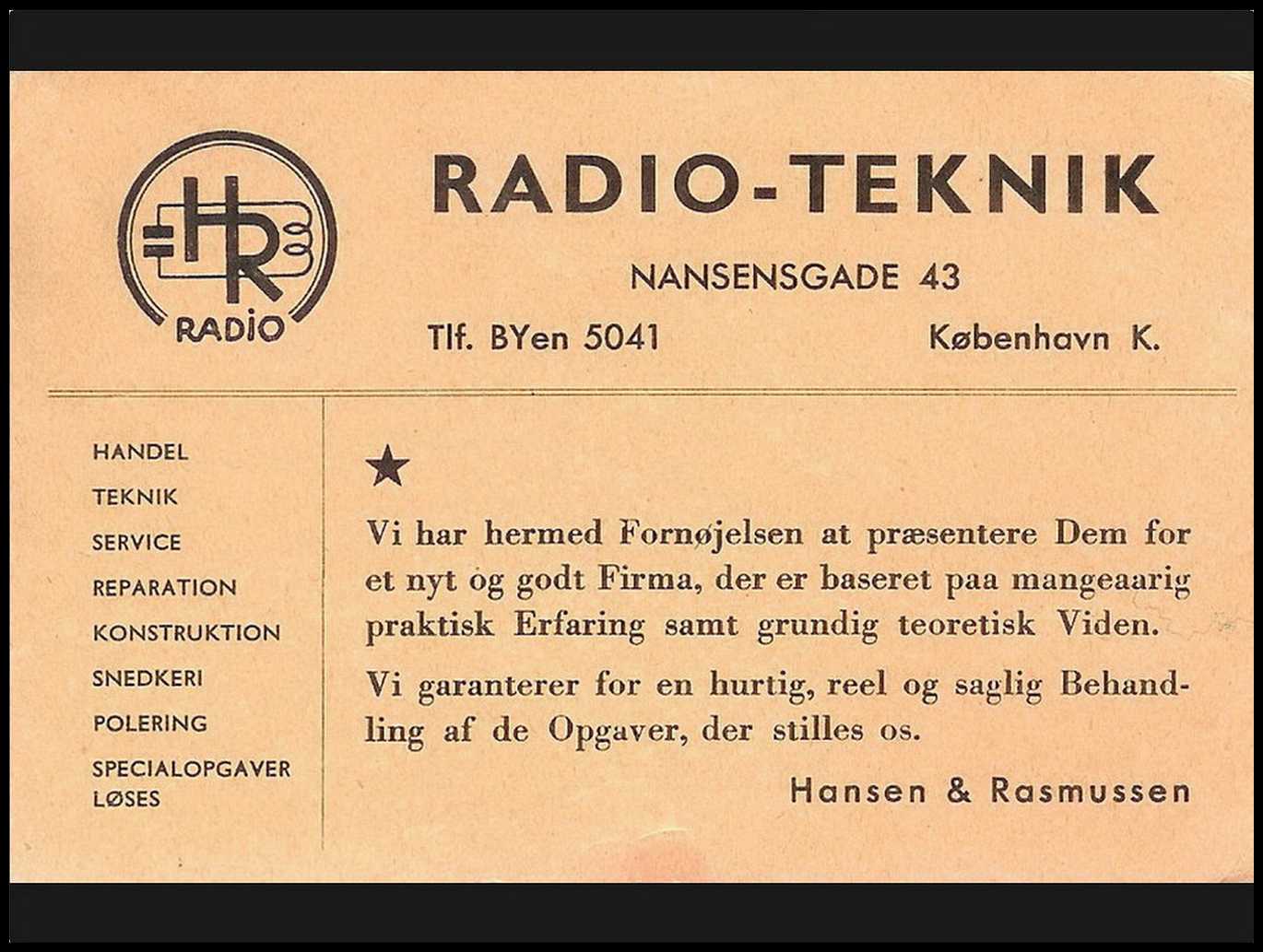 TowerRadio Nansensgade 43 fra 1945-50, hvor en stor del var beboelse. I starten for den oprindelige lejer Ingeborg Damsgaard, senere for Svend og Ruth Hansen indtil sønneke Per stødte til i 1949, hvor man flytter i større llejlighed lige overfor i Nansensgade 64.