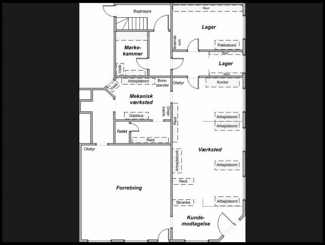 Fra venstre og med uret: Kundemodtagelse, mekanisk værksted, tre lærlingepladser, mesters plads, branddør, skabe til overtøj, elevator, indkommende og færdige reparationer samt vask og køleskab
