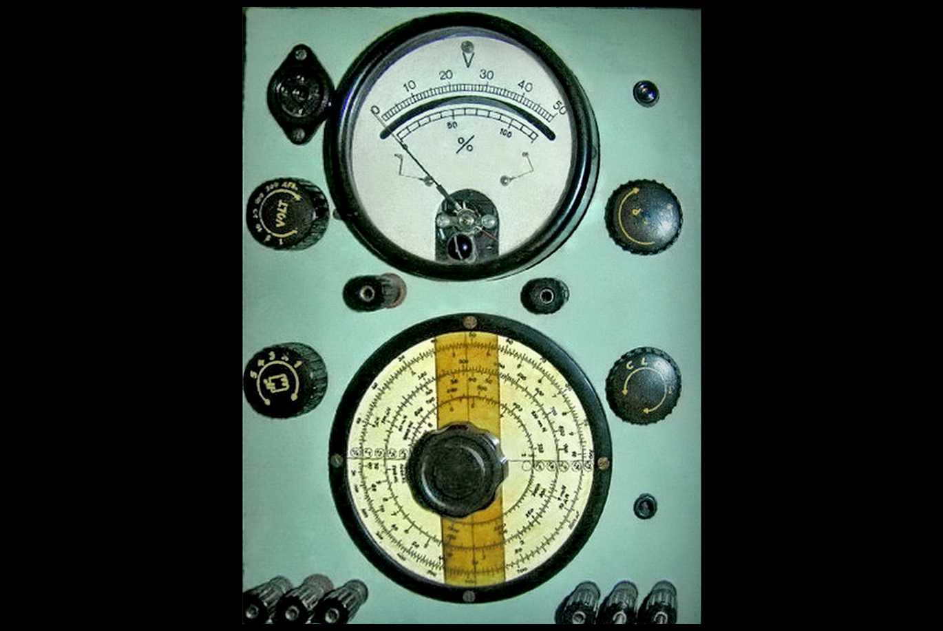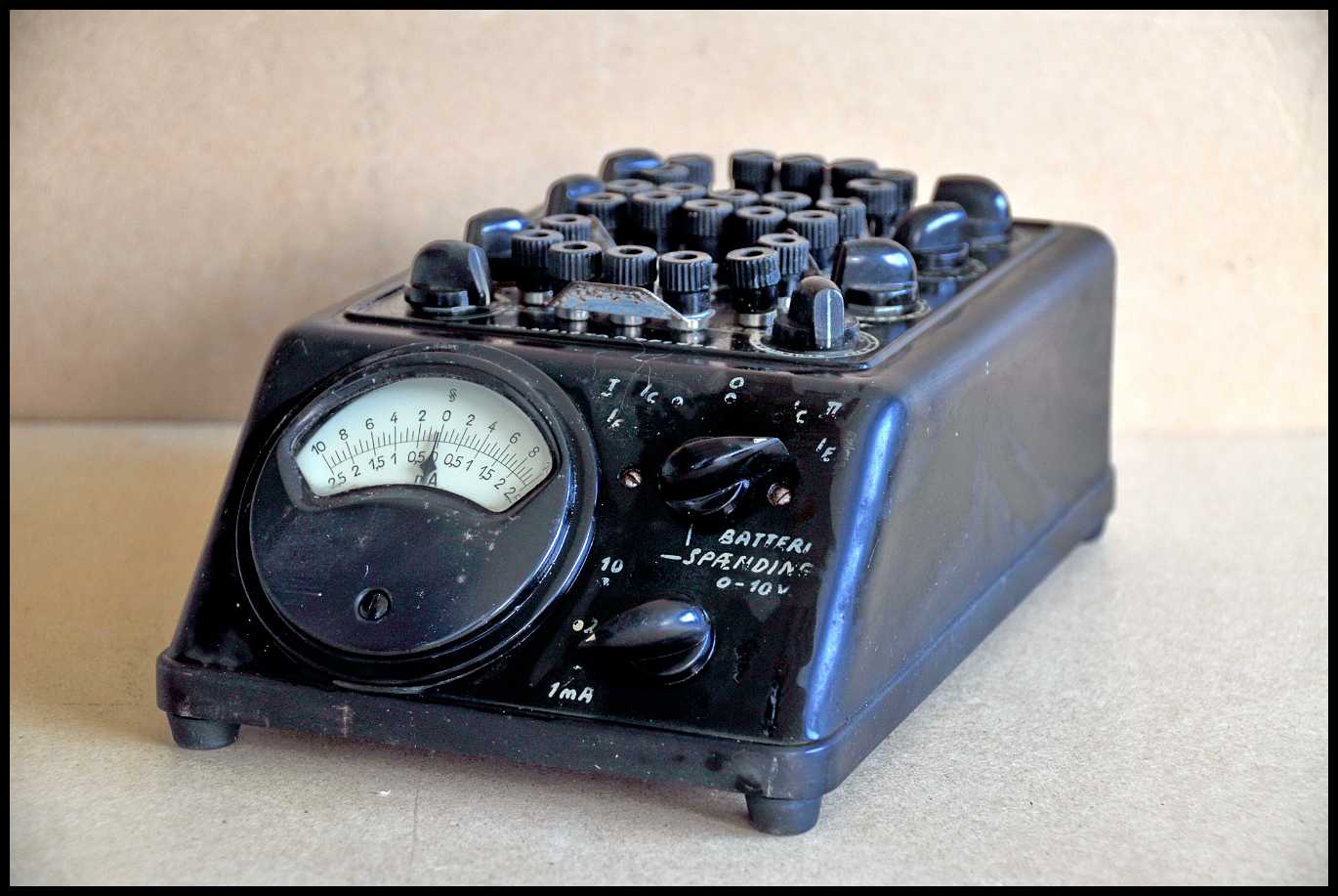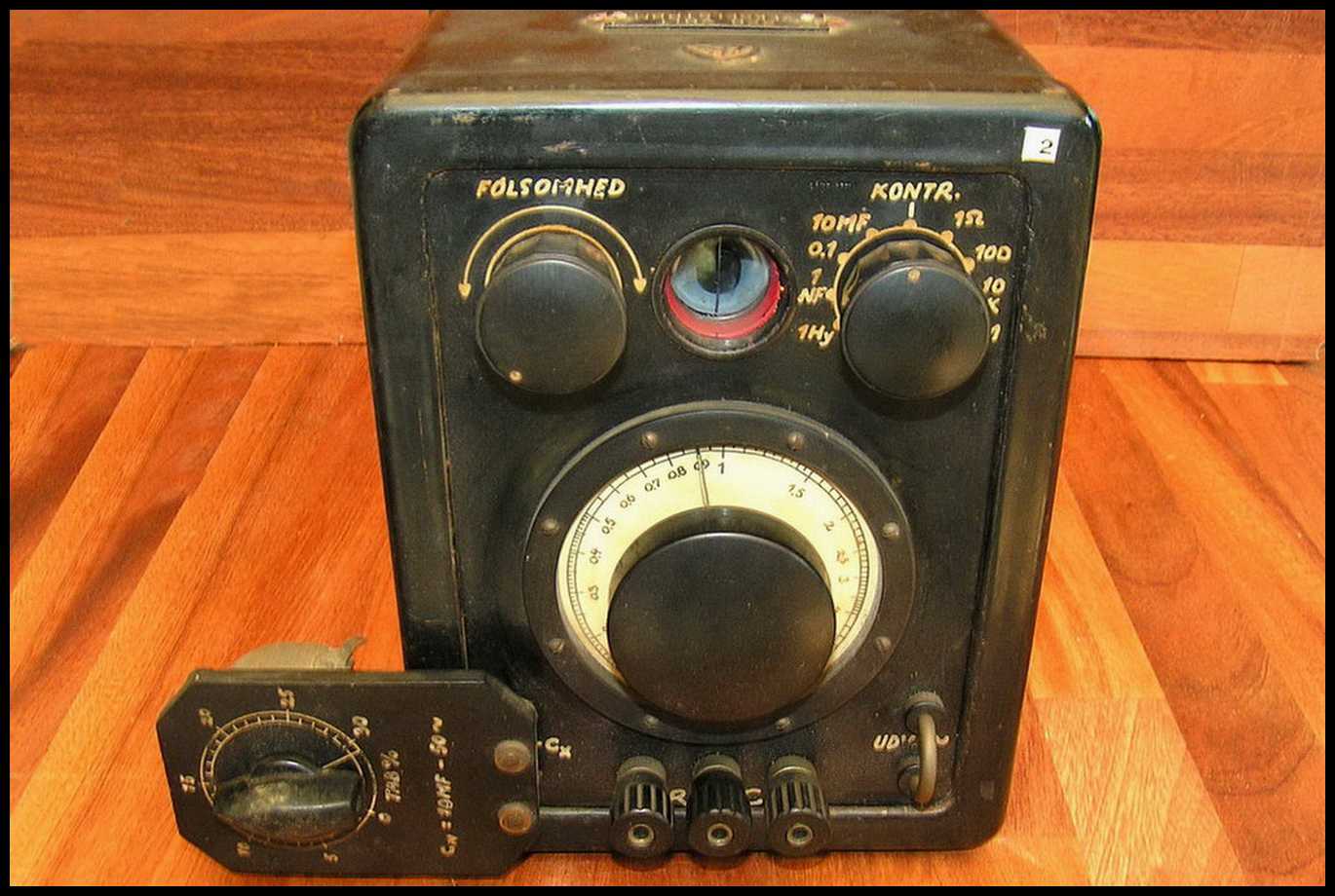 Da denne hjemmelavede LC-måler forsigtigt blev tændt for første gang efter 30 års opmagasinering, målte den sine referencespoler indenfor en viserbreddes nøjagtighed. (Svingspolen skulle dog lige dunkes igang). Kan også ses på foto 9 fra 40'erne og foto 16 fra 60'erne begge under 'Firmaet'.