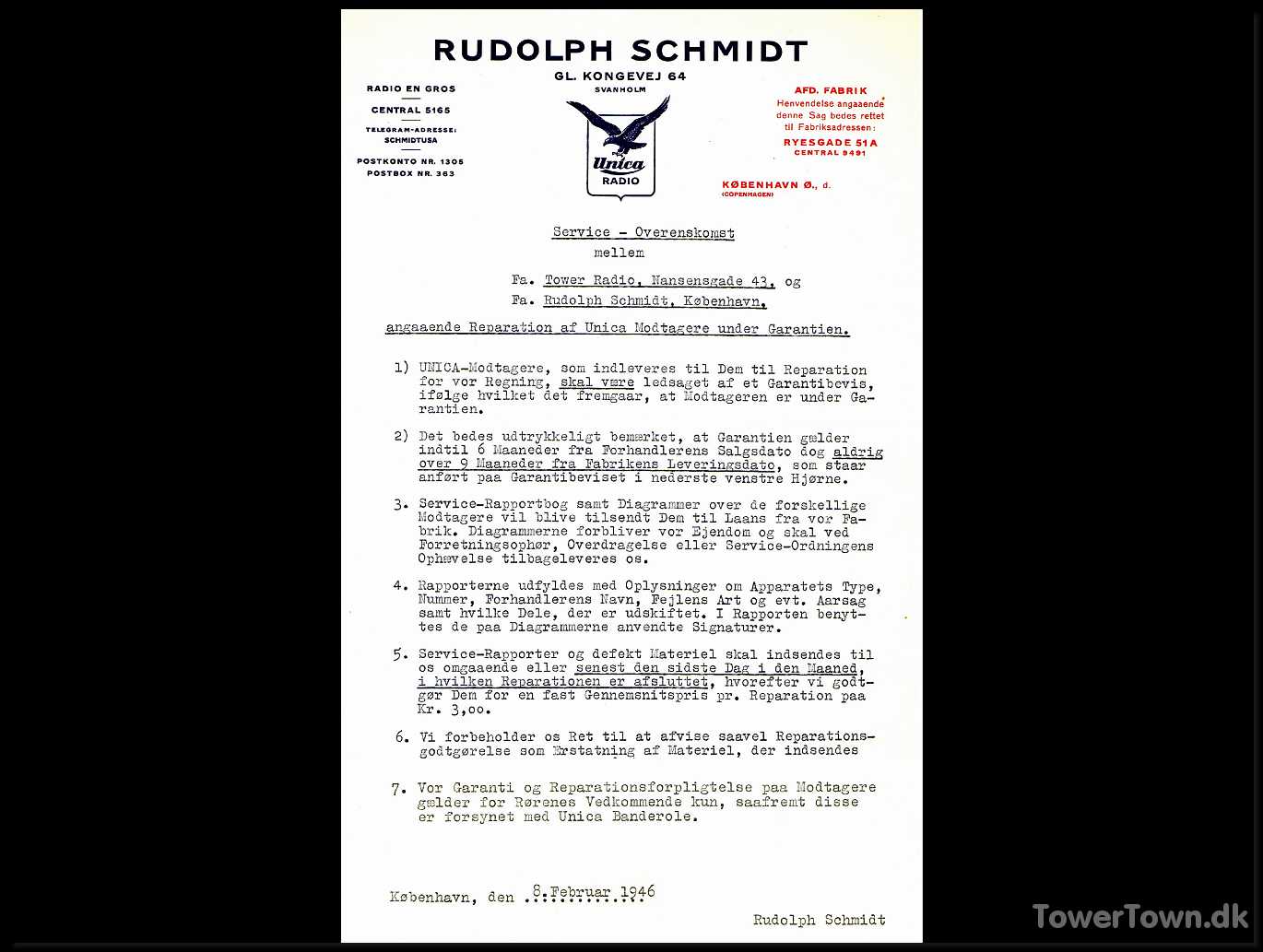 Service overenskomst med Unica Radio fra 8/2-1946. |
