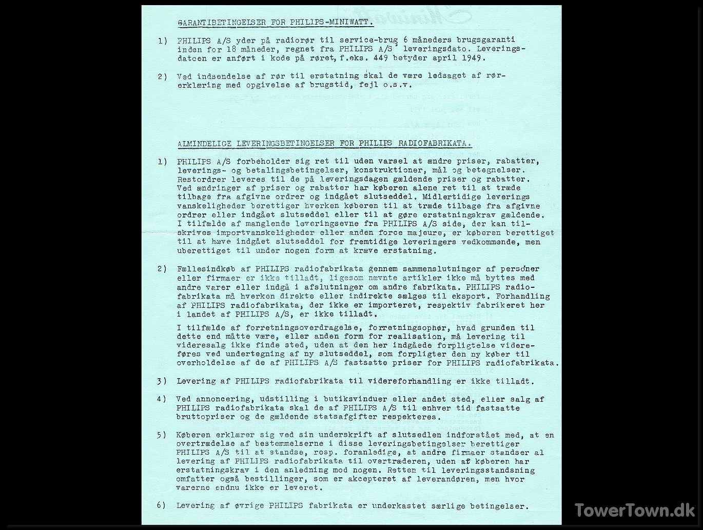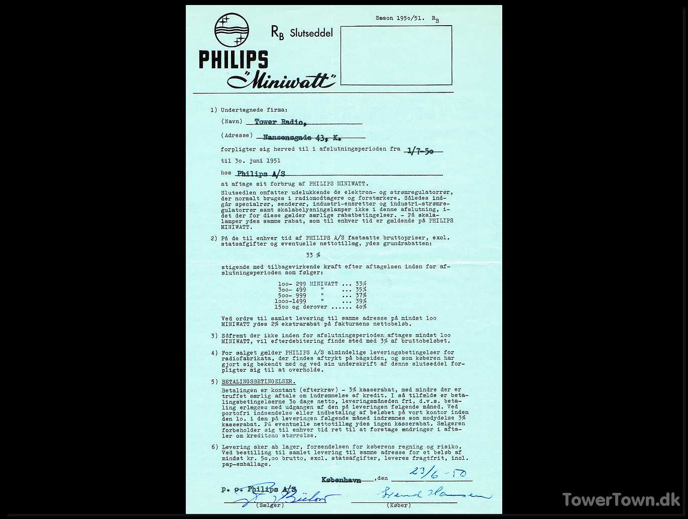 Philips Miniwatt slutseddel fra 1/7-1950. |