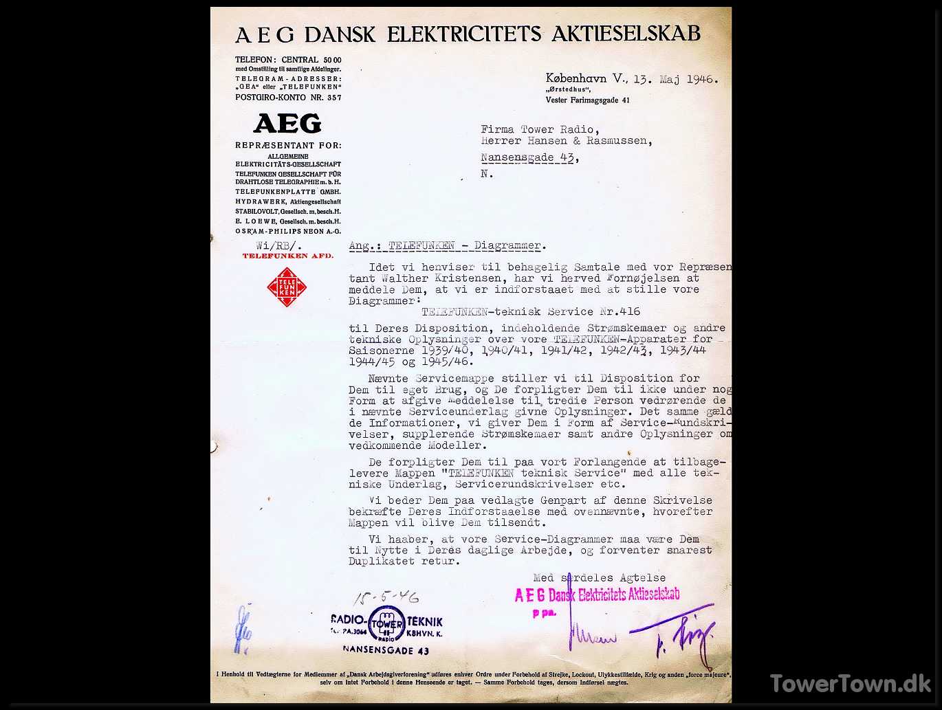 Aftale med AEG om Telefunken-diagrammer fra 13/5-1946. |