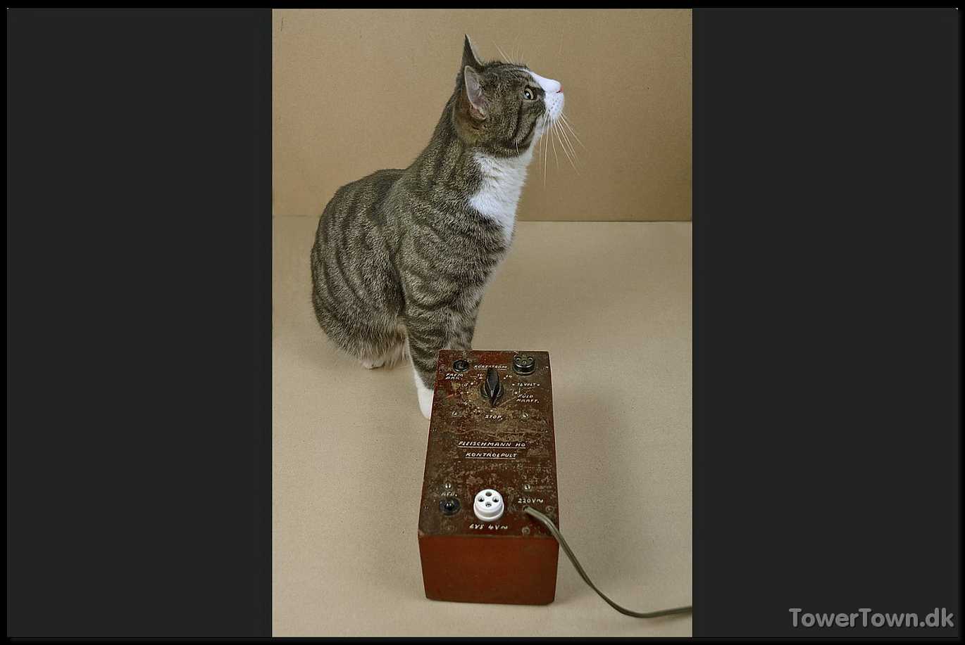 Størrelsforhold mellem kontrolpult og nysgerrig kat.